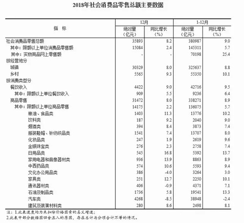 按消费类型分,2018年餐饮收入42716亿元,比上年增长9.5%;商品零售338271亿元,增长8.9%。在商品零售中,2018年限额以上单位商品零售136075亿元,比上年增长5.7%。其中,12月份限额以上单位商品零售14175亿元,同比增长2.2%。