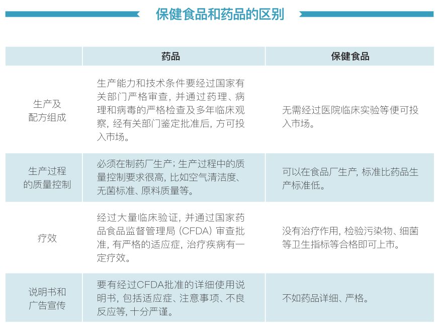 保健食品作为食品的一种,自然与药品有着严格的区别。原国家食品药品监督管理总局官方网站指出了保健食品与药品在生产配方、质量控制、疗效、广告宣传等方面的区别(见下表):