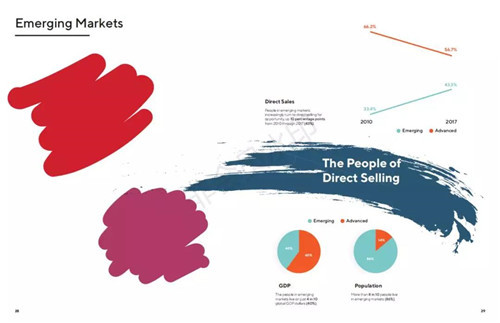 报告指出,新兴市场的直销人员占到全球直销人员的86%,GDP贡献值仅占40%;发达市场的直销人员占到全球直销人员的14%,GDP贡献值却占到60%,从2010年至2017年上升了10个百分点。