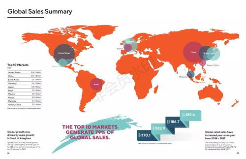 《2017-2018年全球直销报告》指出,目前全球直销十大市场分别为:美国349亿美元(北美洲)、中国343亿美元(亚洲)、韩国172亿美元(亚洲)、德国167亿美元(欧洲)、日本153亿美元(亚洲)、巴西119亿美元(南美洲)、墨西哥59亿美元(北美洲)、法国50亿美元(欧洲)、马来西亚47亿美元(亚洲)和中国台湾39亿美元(亚洲)。其中,亚洲国家和地区占了50%,市场份额达到754亿美元,超其他地区1亿美元。