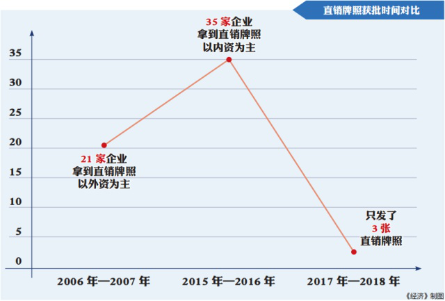 《经济》记者在商务部直销行业管理网站查询得知,直销牌照获批有两个高峰期,2006年-2007年有21家企业拿到直销牌照,以外资为主。2015年-2016年是第二个高峰,以卫康、东阿阿胶、康美来、康尔等内资企业为主,一共35家。