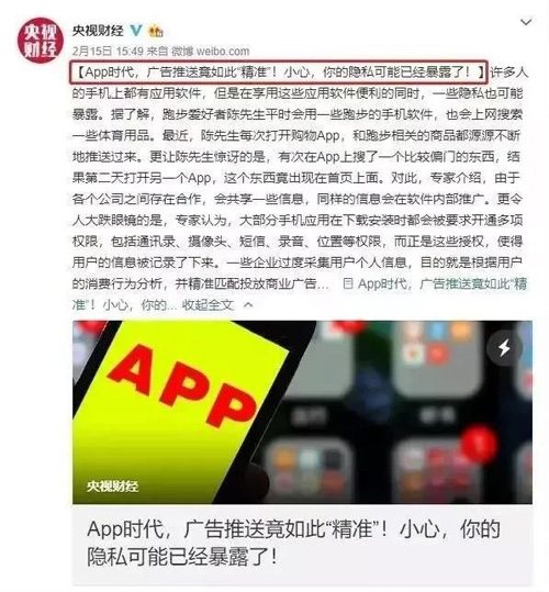 在1月25日发布的#2018年十大消费者侵权事件#中,个人信息也成为了关注重点。仅过去一年,就有多起未经许可采集用户隐私信息的事件曝出,甚至是升级到盗取用户关系链向用户推荐“可能认识的人”、通过App 权限录音权限推送针对性广告等“高阶玩法”。