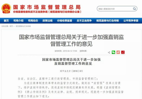 同时公布的还有4月8日 国家市场监督管理总局下发的《关于进一步加强直销监督管理工作的意见》。其中,在加强对直销企业经销商的监管方面要求,各地工商和市场监管部门应对辖区内直销企业的经销商的注册登记信息加强了解,关注其是否有固定经营场所,是否具有合法营业执照,是否与直销企业签订经销合同,是否在经营场所醒目位置摆放营业执照,是否在经营活动中遵守各项法律规定,保障消费者合法权益等。应充分运用各种监管手段,督促辖区内直销企业经销商不得从事直销活动,不得对产品进行夸大虚假宣传,不得以直销企业名义从事商业宣传、推销等活动,不得组织或参与传销。