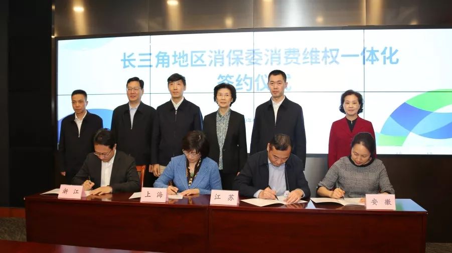 为贯彻落实长江经济带发展、长三角区域一体化发展国家战略,4月17日,上海、江苏、浙江、安徽三省一市消费者权益保护委员会共同在上海签署《长三角地区消费者权益保护委员会消费维权一体化合作协议》。上海市消费者权益保护委员会主任杨定华,中国消费者协会副会长兼秘书长朱剑桥,上海市市场监管局局长陈学军,江苏省市场监管局局长朱勤虎,浙江省市场监管局局长冯水华,安徽省市场监管局局长韩永生、副局长张志宏出席签约仪式。三省一市消费者权益保护委员会秘书处负责同志参加签约仪式。