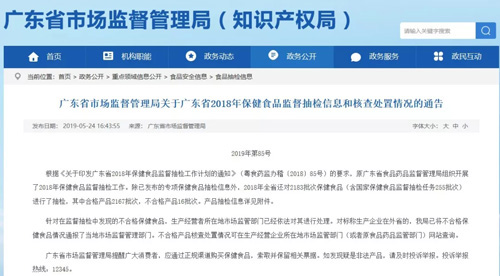 5月24日,广东市场监督管理局发布了《广东省市场监督管理局关于广东省2018年保健食品监督抽检信息和核查处置情况的通告》涉及2193批次保健食品,其中不合格产品16批次。
