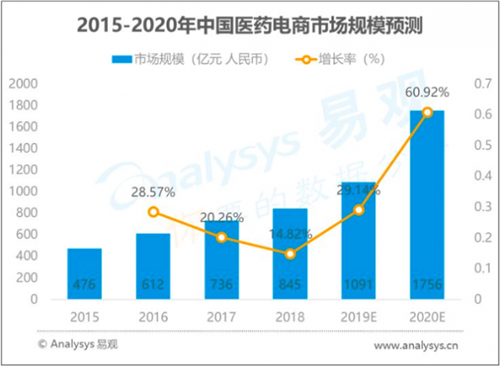 在政策与市场红利的推动下,医药电商的市场规模有望爆发式增长。Analysys易观市场监测数据显示,2019年中国医药电商市场规模将突破千亿大关,较2018年的845亿元上涨29.14%;预计2020年这一数据将大幅增至1756亿元,同比增长高达61%。