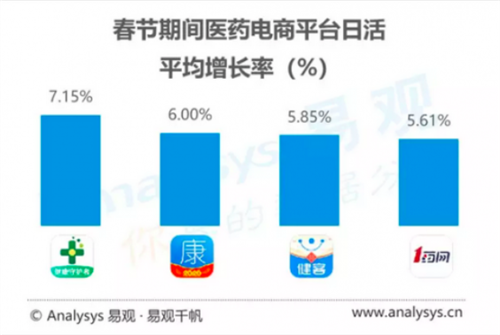 根据易观千帆数据显示,今年春节期间(1.24-1.30),医药电商活跃人数峰值达到148.21万人,平均增长5.44%。