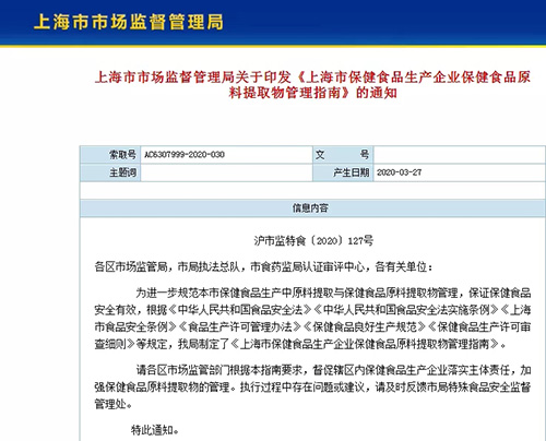 3月27日,上海市场监管局制定并发布了《上海市保健食品生产企业保健食品原料提取物管理指南》(下称《指南》)用于规范上海市保健食品生产企业生产保健食品原料提取物、采购保健食品原料提取物用于生产保健食品的安全管理,保证保健食品安全有效。
