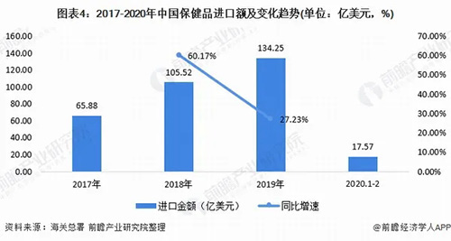 根据中国海关总署的数据显示,2017-2019年我国保健品行业相关的产品进口金额逐年增长,其中,2019年进口金额达到134.25亿美元,同比增长27.23%。2020年1-2月,进口金额为17.57亿美元。