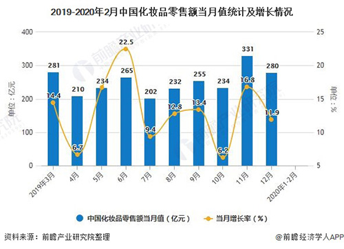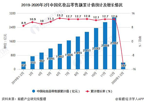 2020年1-2月中国化妆品零售额将近400亿