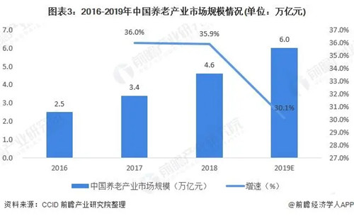2018年中国60岁及以上人口比重为17.9%,老龄化程度远高于全球,预计到2021年中国60岁及以上人口比重为19%。2018年中国养老产业市场规模为4.6万亿元,同比增长35.9%,初步估计2019年中国养老产业市场规模近6万亿元。