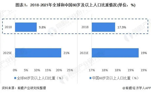 2018年全球60岁及以上人口比重为9.8%,随着老龄化社会的加速,预计到2025年全球60岁及以上人口比重为21%;2018年中国60岁及以上人口比重为17.9%,老龄化程度远高于全球,预计到2021年中国60岁及以上人口比重为19%。