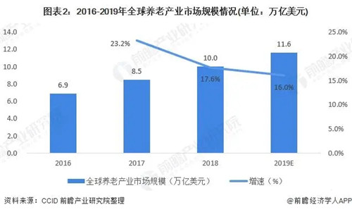随着老龄化社会的加速,养老产业也随之不断发展,2018年全球养老产业市场规模为10万亿美元,同比增长17.6%,初步估计2019年全球养老产业市场规模近11.6万亿美元。