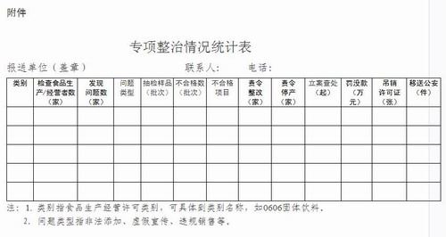请各地市场监管部门将专项整治的基本情况、主要做法、典型案例、发现问题及原因分析、制度建设及工作建议等形成报告,以及统计表(见附件)的电子版、纸质版,于2020年12月10日前报送总局食品生产司。