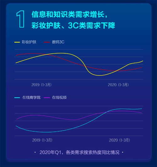 在乘用汽车领域,2020年一季度二手车平台等的相关搜索热度持续攀升。在医疗健康领域,互联网医疗平台搜索热度上涨了50%。此外,从搜索数据看,生产制造、房产装修、金融保险、教育辅导等领域回暖迹象也十分显著。