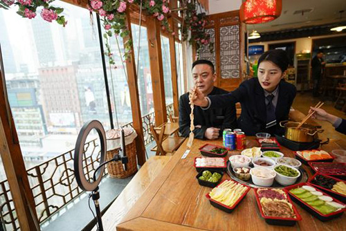 在重庆小天鹅火锅标准化生鲜火锅外卖门店内,企业员工在抖音上进行标准化生鲜火锅外卖的推广直播。新华社记者 刘潺/摄