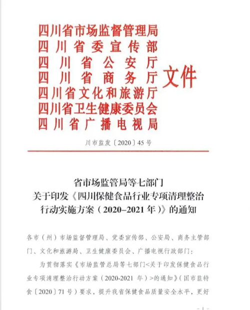 15日,记者从四川省市场监管局获悉,四川省市场监管局等七部门决定从即日起至2021年11月30日联合组织实施保健食品行业专项清理整治行动,提升保健食品质量安全水平,保护消费者合法权益,整治行动将重点整治保健食品领域非法生产经营、欺诈和虚假宣传、违法广告等突出问题。