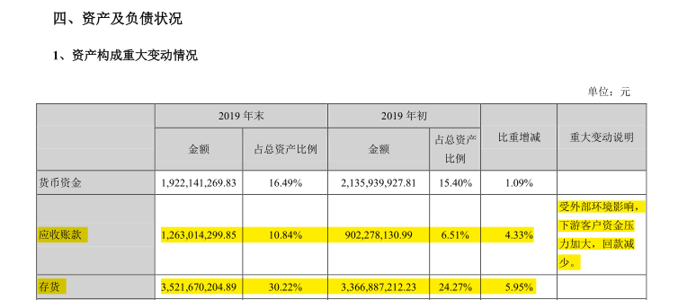 东阿阿胶业绩高速增长的另一面,是经销商囤货压货带来的发展瓶颈。这一现象,也在年报中得以印证。2019年末, 其存货金额高达3,521,670,204.89 元,占总资产比例30.22%;2019年初,存货金额达3,366,887,212.23元,占总资产比例24.27%。日前,《证券时报》就有报道,东阿阿胶2019年业绩下滑,究其原因,是东阿阿胶渠道库存出现持续积压,导致营收下降,直接影响经营业绩。