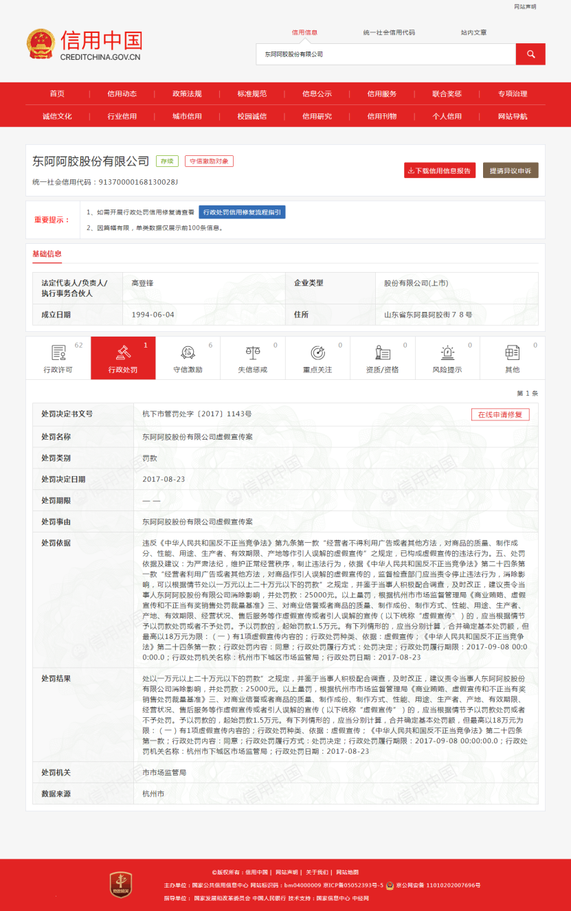 如果说业绩暴跌可归结为经营不善,那么违法违规便是管理不善。东阿阿胶业绩的背后,或离不开其“营销”。经济日报-中国经济网记者在信用中国官网发现,东阿阿胶曾在2017年因虚假宣传被杭州市市场监管局处罚。而2016年到2017年也是东阿阿胶效益最好的时候,净利润达18.52亿元和20.44亿元。