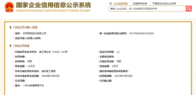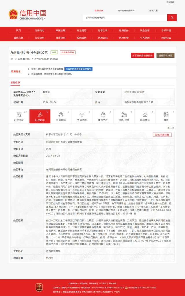 如果说业绩暴跌可归结为经营不善,那么违法违规便是管理不善。东阿阿胶业绩的背后,或离不开其“营销”。经济日报-中国经济网记者在信用中国官网发现,东阿阿胶曾在2017年因虚假宣传被杭州市市场监管局处罚。而2016年到2017年也是东阿阿胶效益最好的时候,净利润达18.52亿元和20.44亿元。