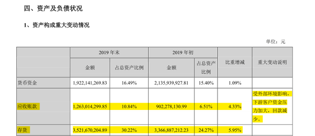 东阿阿胶业绩高速增长的另一面,是经销商囤货压货带来的发展瓶颈。这一现象,也在年报中得以印证。2019年末, 其存货金额高达3,521,670,204.89 元,占总资产比例30.22%;2019年初,存货金额达3,366,887,212.23元,占总资产比例24.27%。日前,《证券时报》就有报道,东阿阿胶2019年业绩下滑,究其原因,是东阿阿胶渠道库存出现持续积压,导致营收下降,直接影响经营业绩。