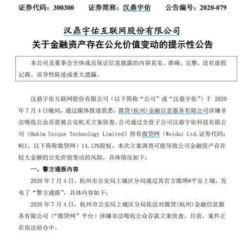 继警方通报微贷网涉嫌非法吸收公众存款被立案侦査后,创业板上市公司汉鼎宇佑5日晚间回应称,公司通过全资子公司汉鼎宇佑科技有限公司持有微贷网14.13%股权,本次立案调查可能导致公司金融资产存在较大金额的公允价值变动的风险。