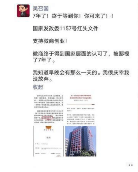 该《意见》一经发布,诸多从事微商的人纷纷在朋友圈开始转发以及奔走相告,甚至连思埠集团董事长吴召国感都慨道,“微商终于得到国家层面的认可了,被鄙视了7年了。”