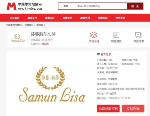 据中国美容加盟网今年5月更新的加盟信息显示,投资30-80万即可加盟莎蔓莉莎,开店成功率为97%。按照该网站披露的加盟流程,完成投资咨询、实地考察、资格审核、签订合同、缴纳费用、总部培训、店面装修后即可开业。