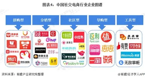 目前,我国社交电商市场共有五大形态。分别是并购型、分销型、社区型、导购型和工具型,每类形态的主要企业如下图所示:
