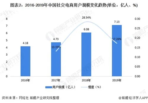 用户是社交电商发展的重要基石。数据显示,近年来,我国社交电商行业的用户规模逐年增长。2019年,社交电商的用户规模达7.13亿人,同比增长17.26%。