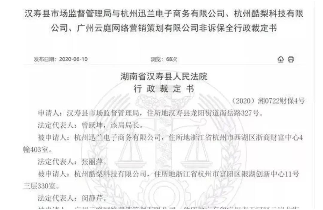 此外,社交财经还注意到,今年6月10日,中国裁判文书网发布的一份针对斑马会员关联公司的非诉保全行政裁定书不胫而走。该文书显示,汉寿县市场监督管理局在查处杭州迅兰电子商务有限公司、杭州酷梨科技有限公司、广州云庭网络营销策划有限公司涉嫌传销一案中,为防止以上公司转移或隐匿违法资金,向湖南省汉寿县人民法院提出申请,对以上三家公司进行非诉保全。据天眼查显示,杭州迅兰正是社交电商斑马会员的公司主体,另外两家公司也与斑马会员相关。