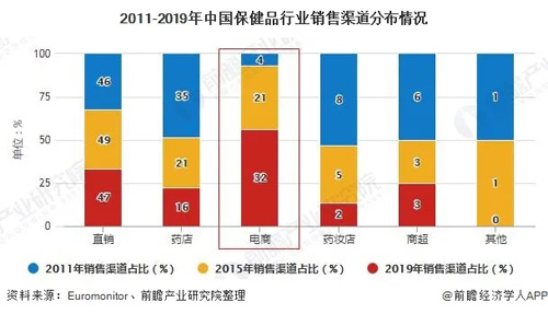 线上渠道起步晚,但增长速度最快。近年来,随着移动互联网的普及,线上渠道捕捉了新一轮流量红利,并很好地契合了保健品消费者长尾的需求。2016年,我国保健品线上销售份额首次超过药店渠道份额,成为仅次于直销的第二大保健品销售渠道,且近五年的复合增速高达31.2%。