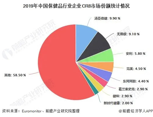 短期内监管趋严导致经营规范的龙头企业受益,市场份额朝头部集中。2019年保健品CR8为41.5%。公司份额方面,受行业整顿打击直销影响,无限极、安利、完美份额分别下滑1.4pct、0.7pct、0.9pct至9.1%、5.8%、4.5%,非直销企业汤臣倍健份额提升2.1pcts至9.9%,超越无限极成为膳食补充剂行业龙头。