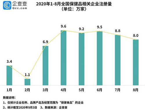 企查查数据显示,2020年2月保健品相关企业注册量跌入谷底,仅1.1万家,环比减少67%。3-4月相关企业注册量激增,3月相关企业注册量达6.9万家,环比增长502%。4月注册量是8个月内最高的,达9.6万家。5-8月相关企业月均注册量达8.9万家。总体来看,今年上半年(1-6月)共新增39.7万家,同比增长35.9%。