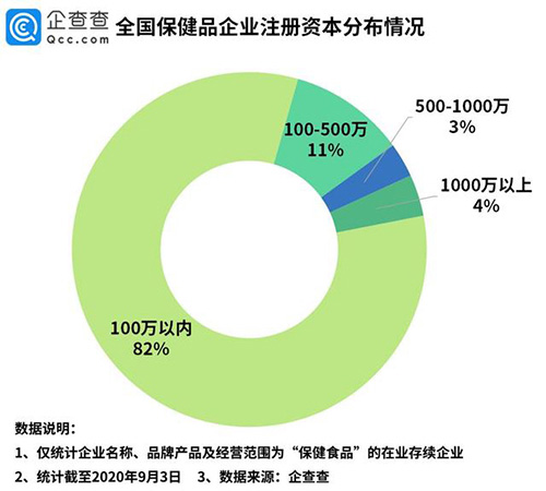 企查查图表显示,注册资本在100万元以内的企业是保健品行业的主力军,占到了总量的82%。而注册资本在1000万元以上的保健品相关公司仅占总量的4%。