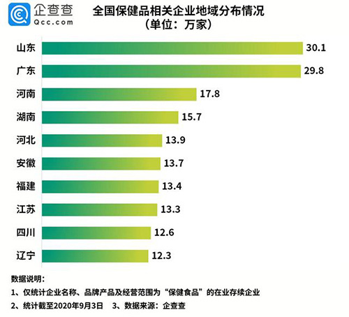 从保健品地区分布来看,企查查数据显示,山东和广东分别以30.1万家和29.8万家相关企业位居全国一、二名,河南、湖南次之,分别为17.8万家和15.7万家。