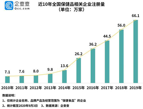 企查查数据显示,近十年来,我国保健品相关企业年注册量呈递增趋势,2010-2014年相关企业注册量年均达9.2万余家。2015年开始,由于新《食品安全法》中明确了保健品的法律地位,给行业吃下了定心丸,因此相关企业注册量增幅明显提高。2015年注册量达26.2万家,同比增长93%。2019年相关企业注册量达到66.1万家,同比增长18%,是10年前的9.3倍。
