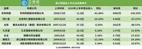 事实上,疫情冲击对保健品行业而言是“有人欢喜有人忧”。企查查整理了部分上市保健品企业,以汤臣倍健为首的头部企业纷纷布局互联网,利用线上模式进行直播购物和单品促销等形式,降低疫情对公司的影响。2020年上半年,九芝堂、健康元和汤臣倍健营业收入呈正增长,而东阿阿胶、同仁堂等品牌今年上半年营业收入呈现大幅负增长。净利润方面,重庆太极实业(集团)股份有限公司今年上半年净利润下滑最严重,同比下降88.53%。
