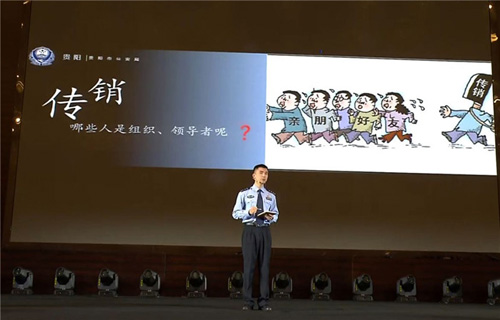 大讲堂上,贵阳市公安、市监、社区代表为现场300余名市民全面展示了贵阳市、贵安新区近年来打传规直工作成果;并通过剖析、展示打击传销典型案例,以案说法;另外还用相声、诗歌朗诵、直播等方式,教育引导社会公众擦亮眼睛,识别传销,远离传销,增强社区打击防范传销综合治理能力。