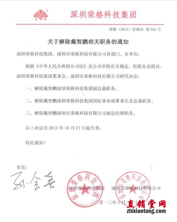 10月27日,荣格官网上发布了新的公告:“根据《中华人民共和国公司法》及公司章程有关规定,经股东会提议,深圳荣格科技集团董事会、深圳市荣格科技有限公司研究决定:一、解除戴智鹏深圳荣格科技集团副总裁职务。二、解除戴智鹏深圳荣格科技集团国际事业部董事长及总裁职务。三、解除戴智鹏深圳市荣格科技集团有限公司副总经理职务。以上决议自2013年10月27日起生效。”
