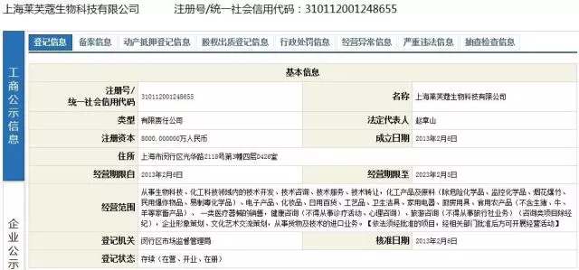 同时,第一直销网在全国企业信用信息公示系统查询上海莱芙寇,结果显示,上海莱芙寇公司成立于2013年2月,法定代表人为赵章山,注册资本为8000万元,正好符合申请直销经营许可证的验资要求。