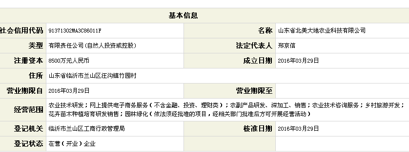 据该公司官网资料显示,山东省北美大地农业科技有限公司】注册资金8500万元,主要以电子商务、生态农业、特色农业、种植加工、园林绿化、乡村旅游为特点,推广绿色产业农产品!