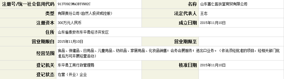 2、山东善仁医扶堂商贸有限公司注册资金300万,法人王志,打造全国善仁医源堂连锁店。