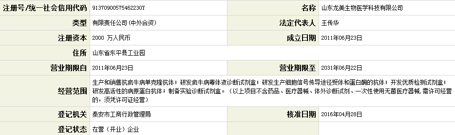 1、山东龙美生物医学科技有限公司注册资金2000万,法人王传华。2015年公司加大投入,建一个高水准的GMP生产车间、建一所肿瘤医院(现已封顶)、建一栋多功能办公大楼以及高科技实验楼。把龙美打造成为最前沿的高科技企业,产品种类不断丰富,不但做到产品在功效上不断更新换代,同时利用自身的高科技研发实力和优势,根据市场的需求热点,适时的开发出市场最需要的产品,造福社会。