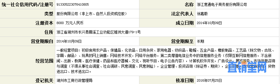 在全国企业信用信息系统查询到浙江意通意通电商公司成立于2014年10月9日,法人是徐嘉蔚,注册资金8000万。宁波康美健生物科技有限公司曾经在2015年09月01日出资500万,现在是股东是北京合胜长兴投资管理有限公司、浙江意康投资管理有限公司、张雪莲。本网编辑查询到该公司董事长是张雪莲,总裁是秦裕林。团队领导人有王晓彬、徐英、娄玉斌、曹芳芳、王喜、王琪宏、谢伟东等等。