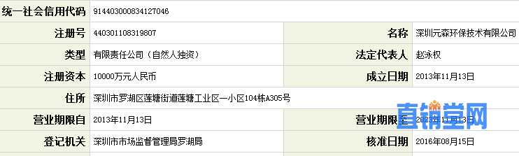 在全国企业信用信息公示系统查询到深圳元森公司注册资金1亿人民币,成立时间是2013年11月13日,法人是赵泳权。