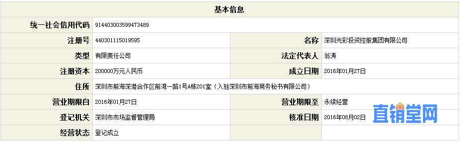 在全国企业信用信息公示系统查询到深圳光彩投资控股集团有限公司注册资金200000万人民币,成立时间是2016年1月27日,法人是翁涛。