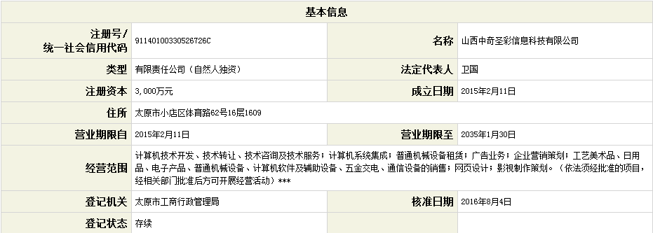 头条君(微信公号id :ds-toutiao)在全国企业信用信息系统查询到该公司注册资金3,000万元人民币,2015年2月11日成立,法人是卫国,股东也是卫国。董事长是张凌云,CEO美优卡科技董事长是jason孙,市场总监是熊荟,高级顾问是高军,行政总监是任天,财务总监是杨文燕。公司业务版块有江源生物、星多网、中奇商学院、易换生活。