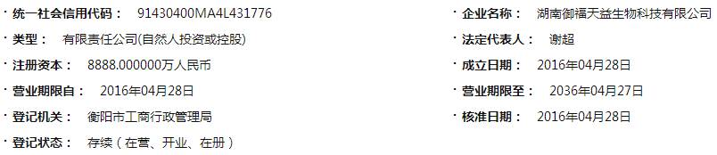 本网编辑在全国企业信用信息系统查询到御福天益注册时间是2016年4月28日,注册资金8888万元人民币,法人是谢超,股东是谢超和刘远晓,董事长是邓崇光,公司所在地在衡阳。