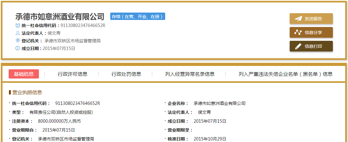 据官网资料显示,承德如意洲酒业有限公司(原名:如意酒厂)成立二十多年,生产浓香型、清香型,高,中,低端白酒,消费者质量诚信级企业,注册资金八千万,生产基地位于双滦区单塔子村,130亩的生产基地(办公大楼、生产车间),职工有1000多人,4条生产流水线,年产总值20亿,有20多年的历史。